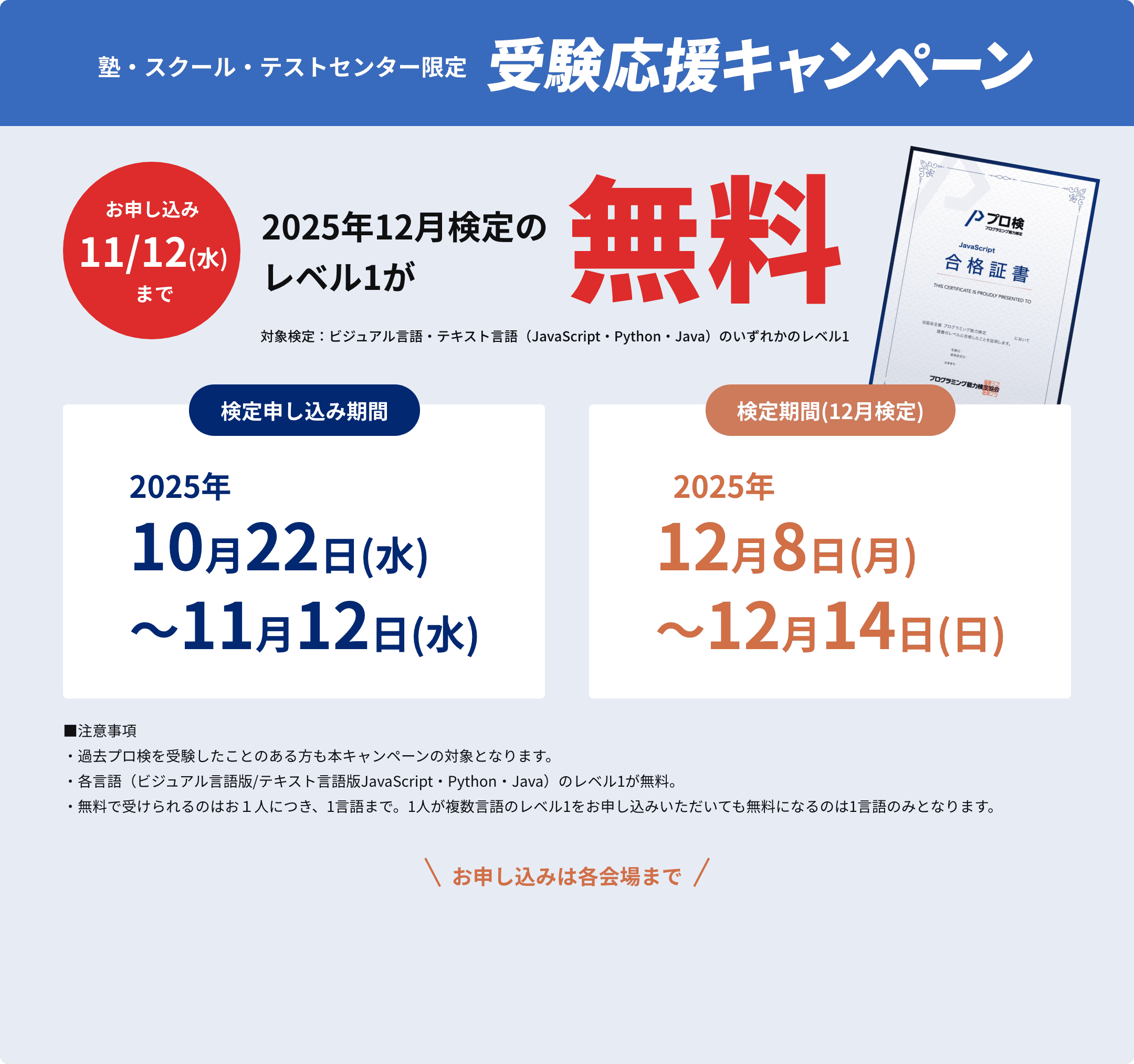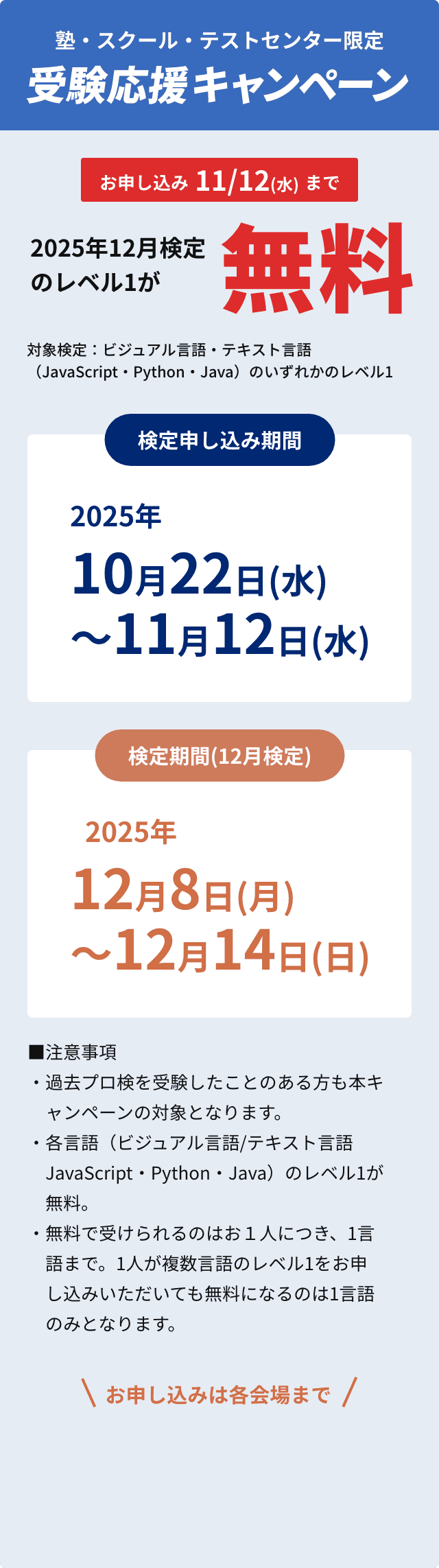 ビジュアル言語・テキスト言語(JavaScript・Python・Java)で受験可能です。